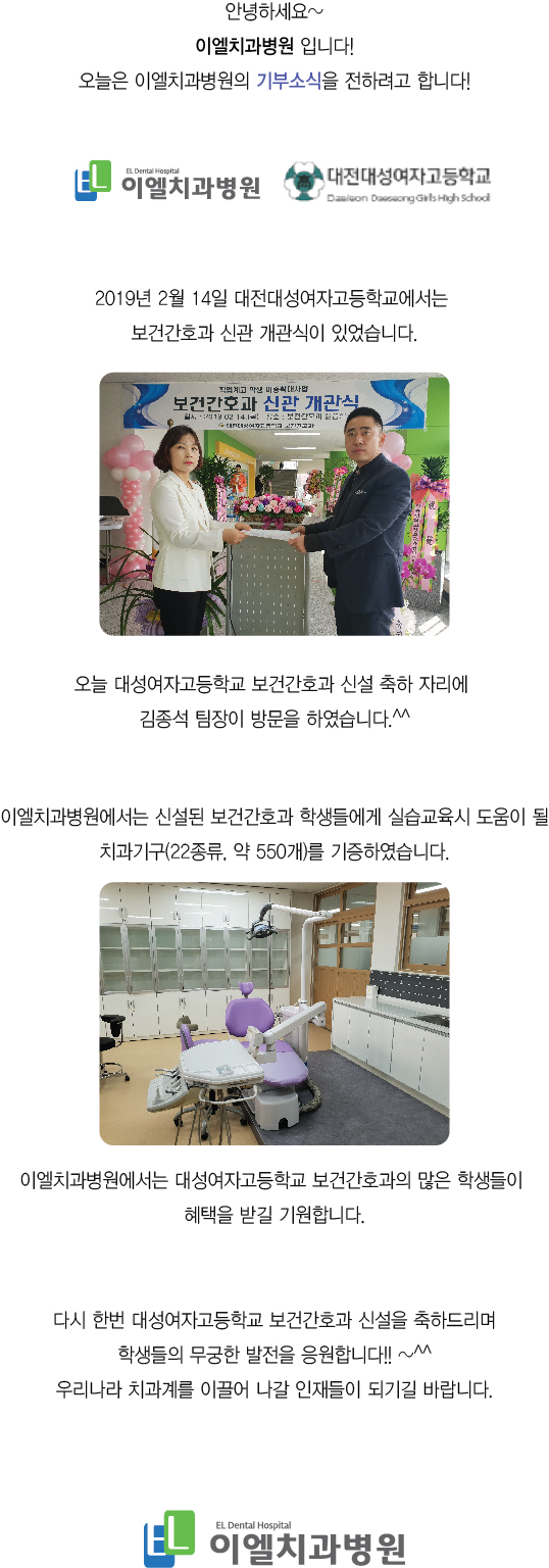 ÀÌ¿¤Ä¡°úº´¿ø, ´ë¼º¿©ÀÚ°íµîÇб³ Ä¡°ú±â±¸ ±âÁõ!