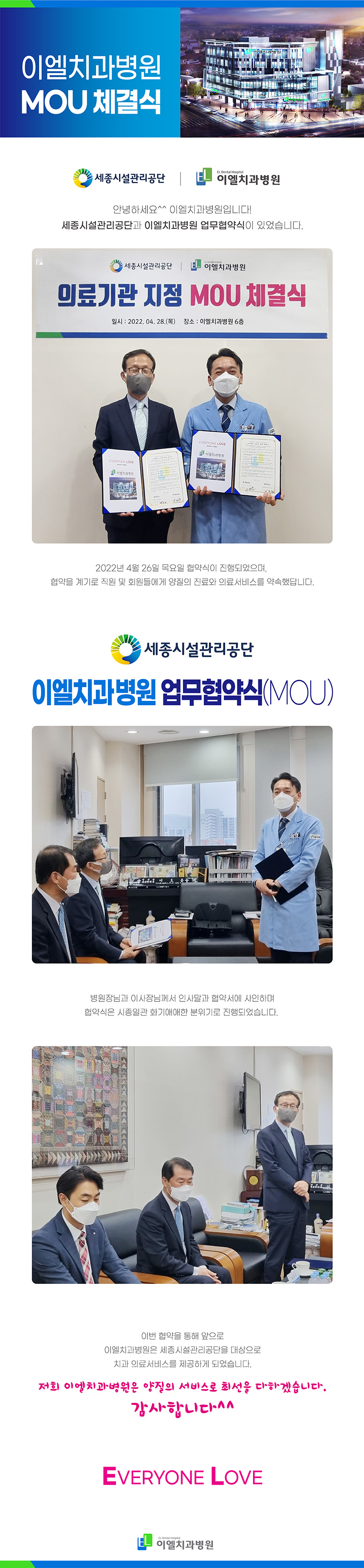 ¼¼Á¾½Ã¼³°ü¸®°ø´Ü-ÀÌ¿¤Ä¡°úº´¿ø MOU Çù¾àü°á (2022.04.26)