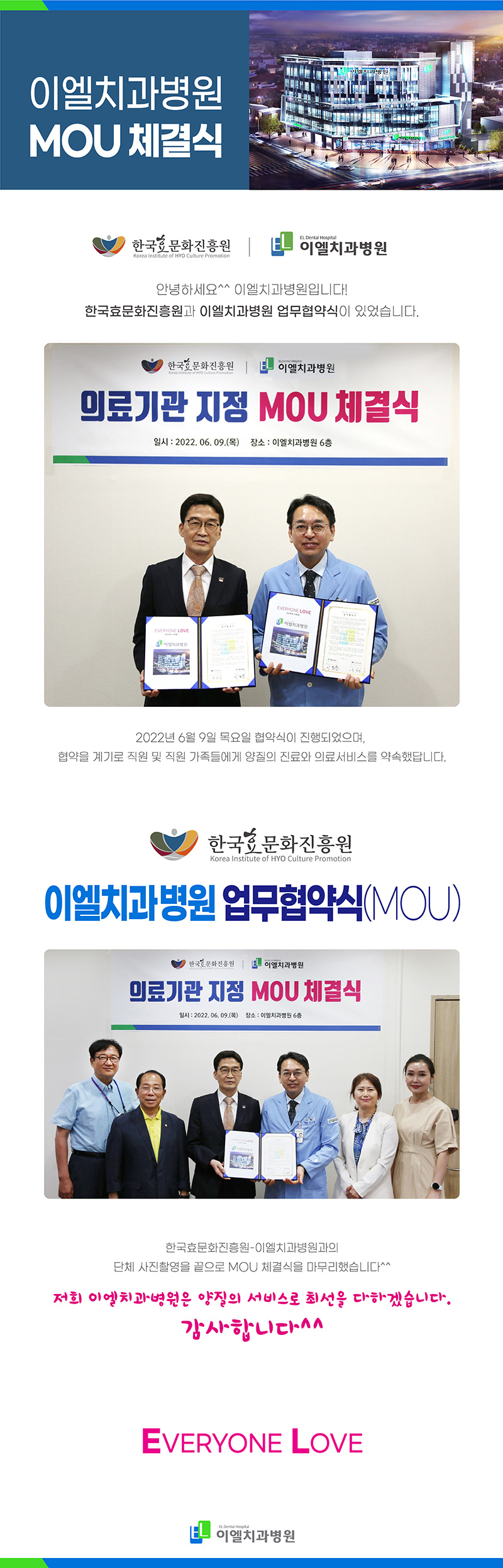Çѱ¹È¿¹®ÈÁøÈï¿ø-ÀÌ¿¤Ä¡°úº´¿ø MOU Çù¾àü°á (2022.06.09)