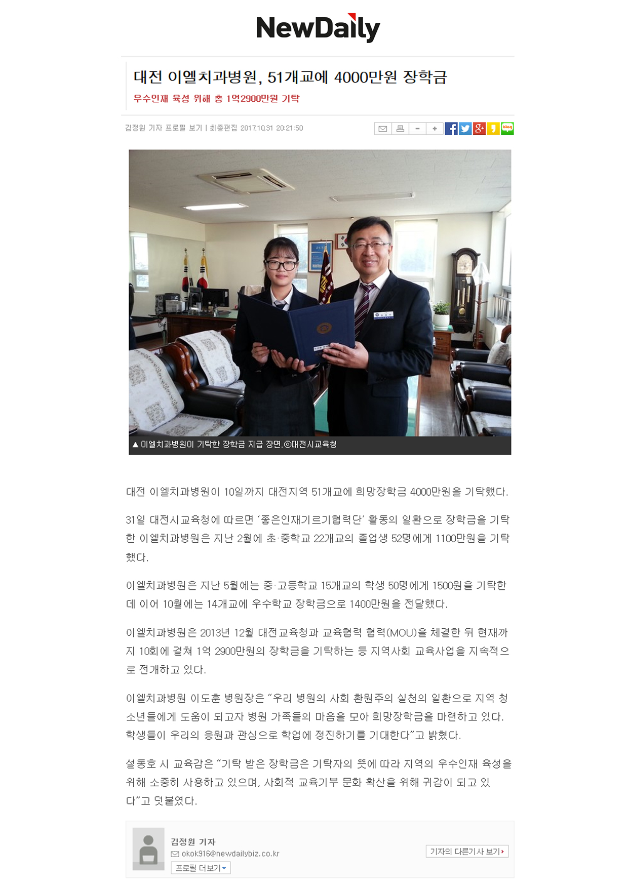 [´ºµ¥Àϸ®] ´ëÀü ÀÌ¿¤Ä¡°úº´¿ø, 51°³±³¿¡ 4,000¸¸¿ø ÀåÇÐ±Ý ±âŹ
